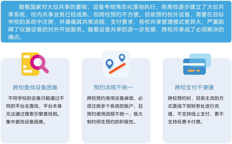 缺少一个信息集中的、权威的管理与交流平台,有限的仪器设备资源信息得不到充分的交流,传统共享管理方式不能支撑日常设备预约使用的需求,存在设备闲置的情况;另一方面由于大精仪器设备价值高,很多经费不足的科研单位以及社会上的初创的研发型企业想用但没有资源。