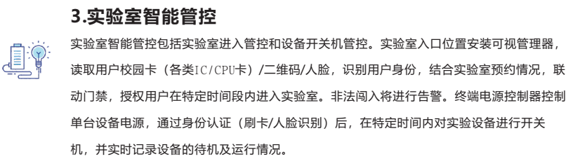 设备实际运行情况无法监管,且难以客观准确收集信息,以机组填报为主使用手工统计,监控无法精准区分关机、待机、运行等数据,数据真实性核实困难。仪器的使用记录,无法得到追溯和实时监控,导致设备使用效率低下。无法进行有效的仪器及实验技术人员的考核、仪器使用管理。