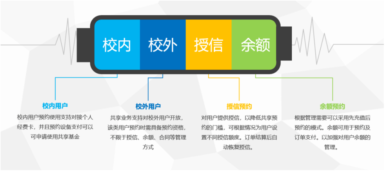 支持对校内及校外用户开放共享,根据高校管理需要可通过授信预约、充值预约等多种经费账户预约管理方式