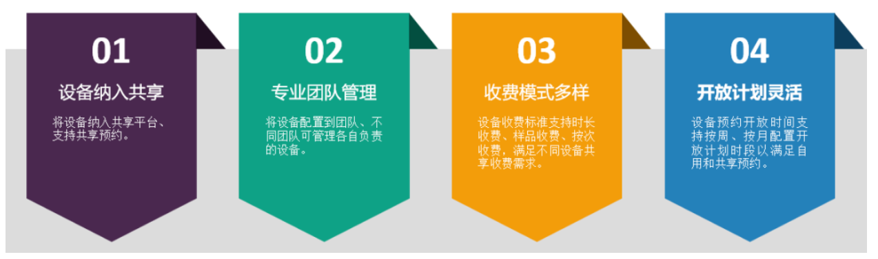 具体涉及开放共享设备、设备专业管理配置团队、共享设备实验项目收费管理、共享模式设置(时长预约、按次预约、按样本数预约)、校内实验共享基金补贴、订单结算确认及支付等功能。